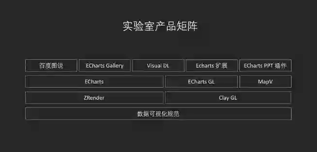 百度数据可视化实验室的产品矩阵如下图所示,内容涵盖基础库、各种可视化产品以及应用产品。