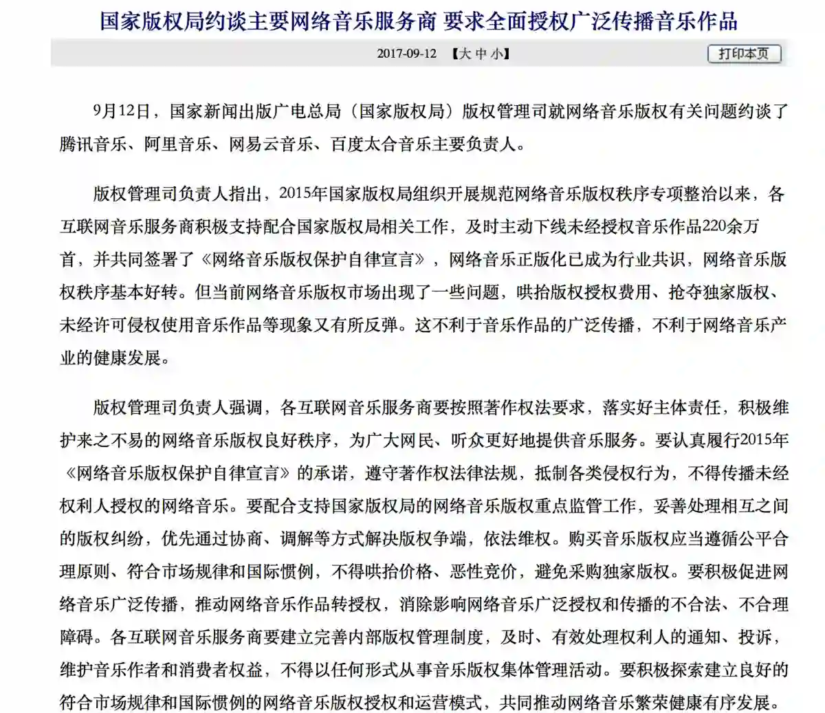 但就在吃瓜群众感慨「心疼网易云音乐」的时候,事情急转直下,同一天,国家版权局发布了一则通告。