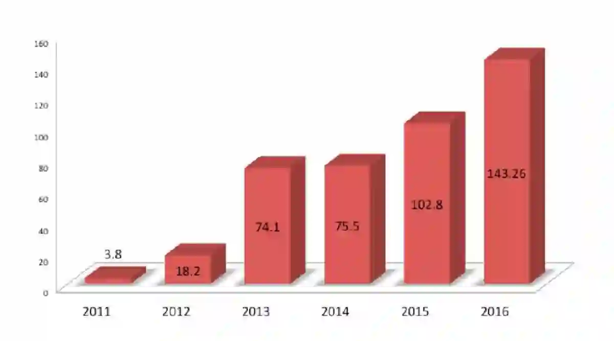 中国数字音乐产值规模,数据来源《2017中国数字音乐市场发展报告》