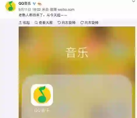 在经历歌曲下架、法院诉讼、公关战之后,9月12日,腾讯音乐与网易云音乐之间的版权纷争终于有了个情理之中,意料之外的结局——腾讯音乐和阿里音乐达成版权转授权合作,简单来说就是互换部分曲库。五月天、林宥嘉、田馥甄、李宗盛等一大批拉流量的知名歌手回归 QQ 音乐,虾米也终于迎来了 BIGBANG 和周杰伦。在正式公布版权合作消息的前一天,QQ音乐就在微博上发了一张意味深长的图片。