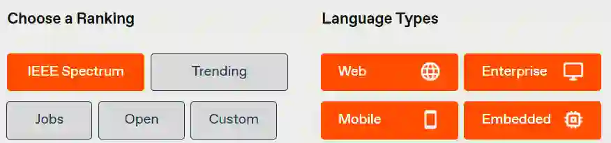 另外需要指出的是,IEEE 将编程语言以四个标签划分,分别是:用于开发网站和应用的语言(Web)、用于企业、桌面和科学应用的语言(Enterprise)、用于移动设备端的语言(Mobile)以及用于嵌入式环境的语言(Embedded)。