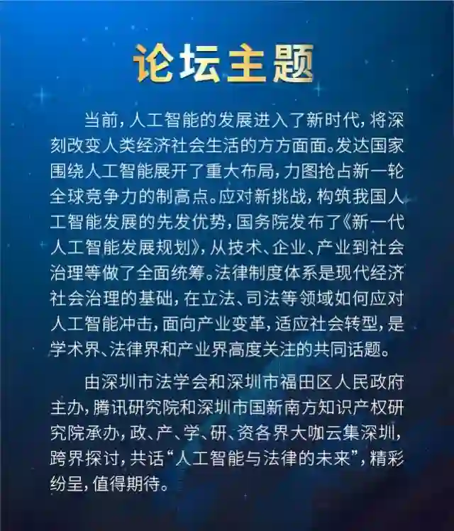 为了更好地发掘人工智能在法律行业的机遇,以及更好地理解人工智能带来的新问题、挑战和影响,腾讯研究院携手深圳市国新南方知识产权研究院,共同承办“人工智能与法律的未来高峰论坛”。