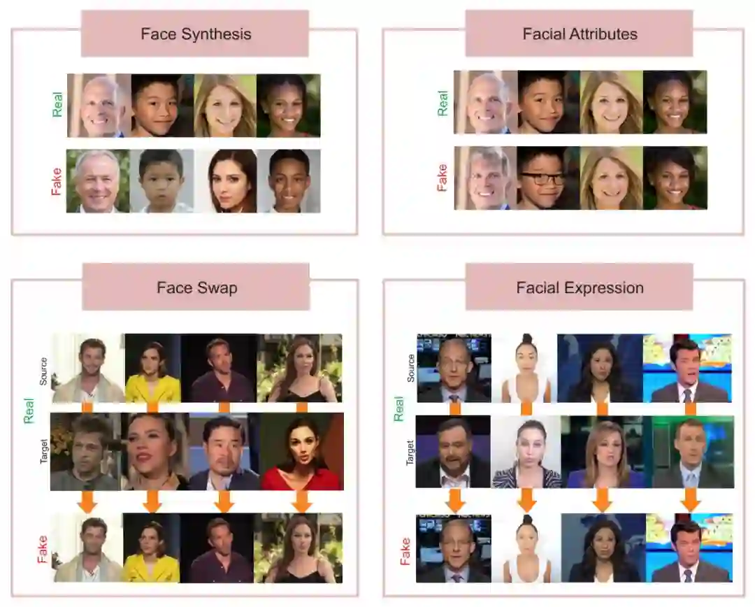 人脸属性操纵:即修改人脸的某些属性,如发色、肤色、性别、年龄、是否戴眼镜等。该操纵过程通常使用 GAN 完成,如 StarGAN。该类型的典型示例是流行的移动应用 FaceApp;