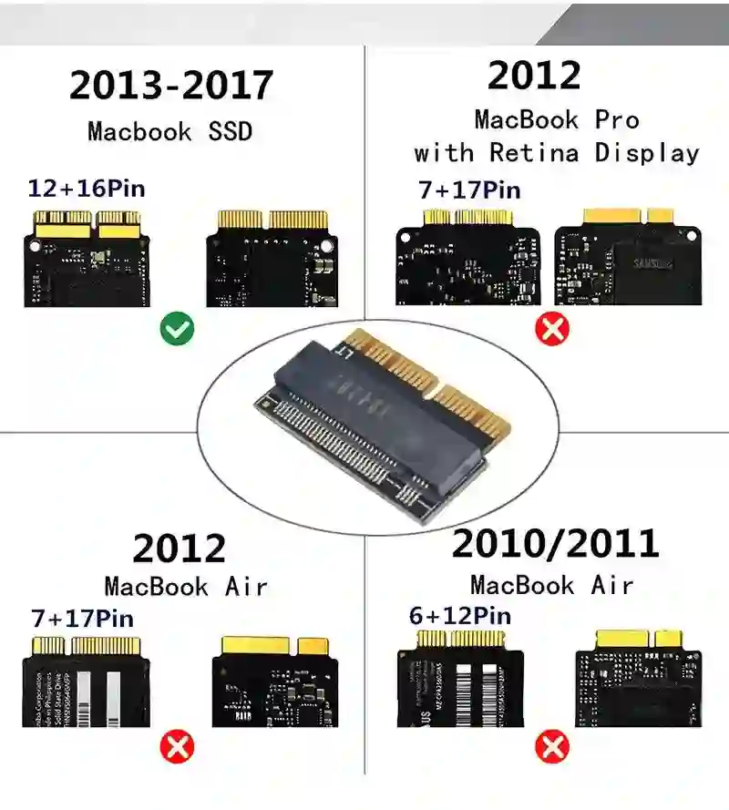 早先的 MacBook 是支持更换 SSD 的,只不过嘛,你要么花大价钱找苹果官方更换,要么选购苹果指定的兼容 SSD——但也便宜不了多少。好在,聪明的配件厂商做出了 MacBook 专用的固态硬盘转接卡,国内最便宜的 20 来块钱就能买到,从此摆脱苹果束缚,用上第三方的 M.2 硬盘。