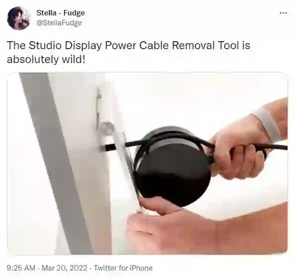 实际上,苹果“不可移除”的说法并不准确,官方有一套专门的工具,用来拔下显示器的电源线。这个工具是一个带手柄的圆形滚轮,操作者要先将电源线缠绕在滚轮上,以均匀地扯出线缆。