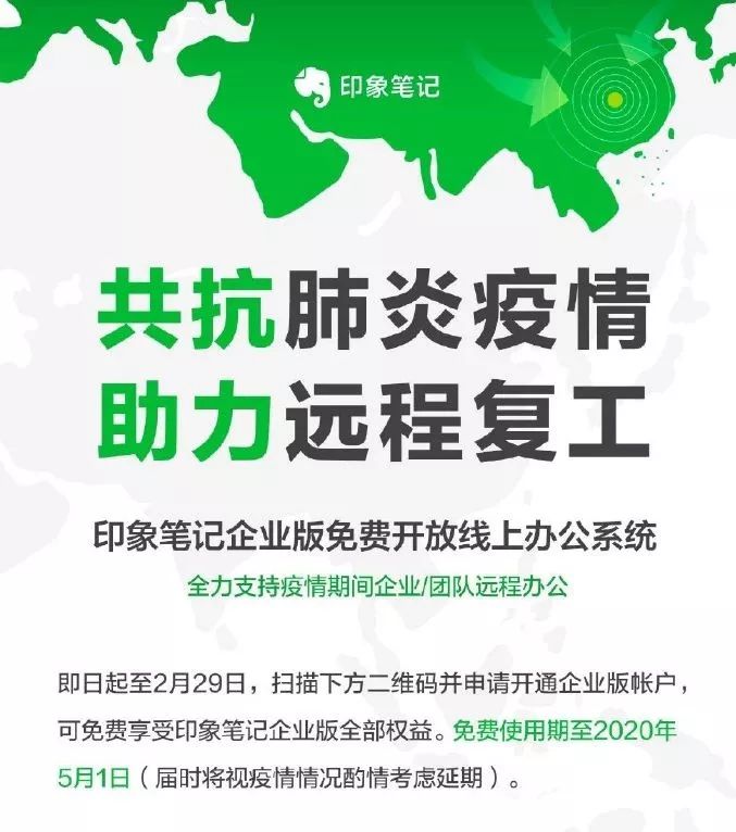 2020 年 2 月 29 日前,凡成功填申请中小微企业和团队,可免费使用印象笔记企业版全部功能,开启远程协同办公;