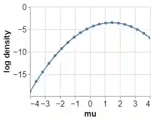 import numpy as npimport pandas as pdimport altair as altfrom smolppl import Normal, LatentVariable, ObservedVariable, evaluate_log_density#Define model#Weakly informative mean priormu =LatentVariable("mu",Normal, [0.0, 5.0])#Observation model. I make some observations y_1, y_2, ..., y_n and compute the#sample mean y_bar. It is given that the sample mean has standard deviation 1.y_bar =ObservedVariable("y_bar", Normal, [mu, 1.0],observed=1.5)#Grid approximation for the posterior#Since the prior has mean 0, and the observations have some uncertainty, I#expect the mode to be a bit smaller than 1.5. Something like 1.4grid =np.linspace(-4, 4, 20)evaluations = [evaluate_log_density(y_bar, {"mu": mu}) for mu in grid]#Plottingdata =pd.DataFrame({"grid":grid, "evaluations": evaluations})chart =alt.Chart(data).mark_line(point=True).encode( x=alt.X('grid', axis=alt.Axis(title="mu")), y=alt.Y('evaluations', axis=alt.Axis(title="logdensity"))).interactive().configure_axis( labelFontSize=16, titleFontSize=16)chart