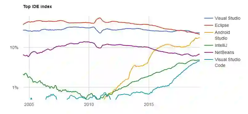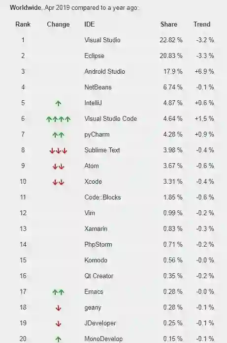 全球范围来看,微软作为最懂开发者的公司,其打造的 Visual Studio 也是最受欢迎的 IDE。此外,Android Studio 的采用率在过去 5 年中也增长最多,达到 14.5%。而 Eclipse 和 Java 有着看似息息相关的命运,在过去 5 年里丢失了最多的份额,以 -16.2% 的数据垫底。