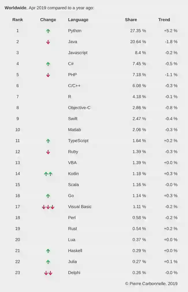 前五的分别是:Python、Java、Javascript、C# 和 PHP。可以看到,榜单没有什么大变化,但是相比去年 4 月份,Python 市场份额在今年上涨了 5.2%,成绩颇为亮眼。