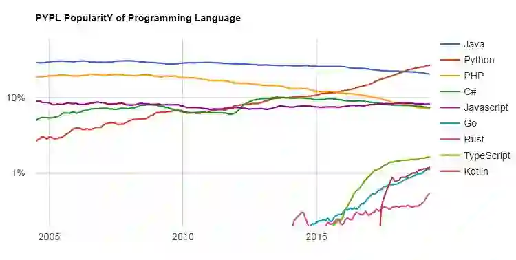 ▲TOP 5 编程语言和新兴的热门编程语言 PYPL 指数趋势图