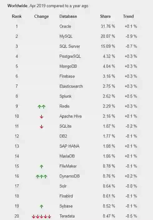 关于 PYPL 四月榜单的介绍到此为止,有兴趣的童鞋不妨再继续阅读来自 DB-Engines 四月份的数据库排行榜↓↓↓