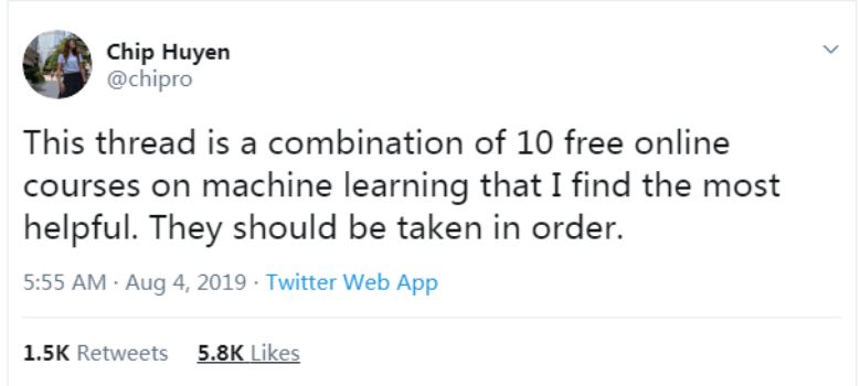 在本文中,来自英伟达人工智能应用团队的计算机科学家 Chip Huyen 不仅列出了十大优质的免费机器学习课程资源,还将其串成了一条高效的学习路线。