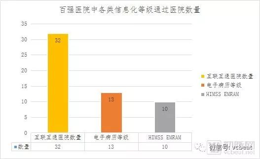 由表可知,通过互联互通标准化成熟度测评的医院为32家,通过电子病历系统应用水平分级评价的医院为13家,通过HIMSSEM RAM评级的医院为10家。可以认为,目前国内顶级医院更倾向于参与互联互通标准化成熟度测评。(注:以下内容中出现的高、低等主观评价,只是相对本百强榜而言)