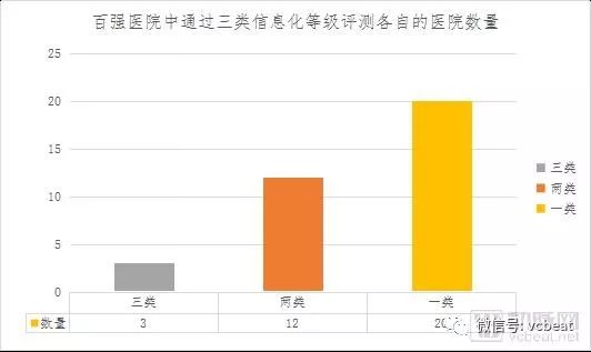 考虑到有些医院通过了不只一类等级评测,因此动脉网对百强医院通过的类别数量进行了统计,发现共有35家医院通过了三类评测中至少一类。换句话说,有65%的百强医院连一种等级评测都没有通过。