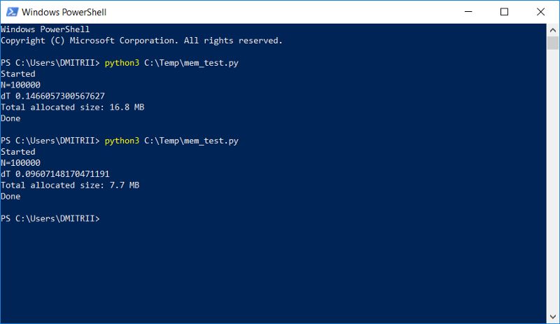我们确认:是的,确实很重要,get_size (d1)返回…64字节,而不是460字节,即少7倍。另外,创建对象的速度要快20%(请参阅本文的第一个屏幕截图)。