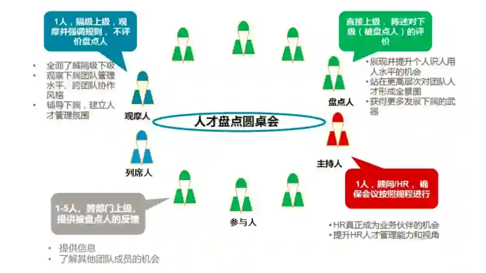 盘点会最主要的内容是由被盘点人的直接上级在会上陈述对下级的评价,由参与人进行校准,参与人一般是平行部门的领导,列席人与观摩人只听不说。盘点会后的结果,将成为正式的人才盘点结果。各参与角色如下: