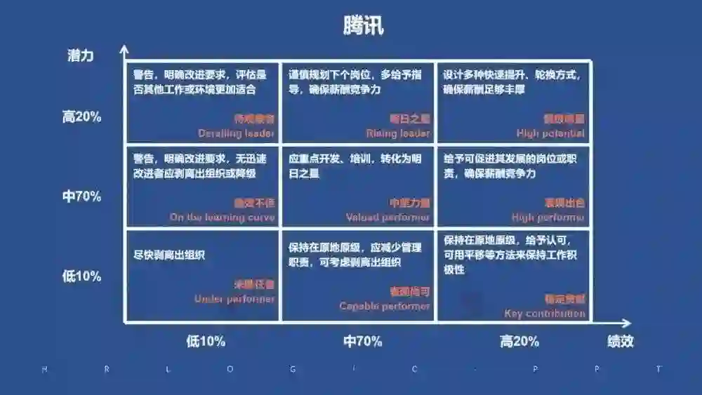人才盘点结果输出为人才九宫格,也是大部分公司使用的工具,大同小异。比如腾讯和京东如下: