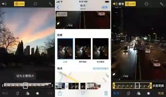 如今,iOS 11 又针对 Live Photo 进行了一次大升级,支持更丰富的操作了。首先,你可以重新选择静态封面照片(下方图一),对动画的长度进行调整(下方图三)以及将画面静音了。