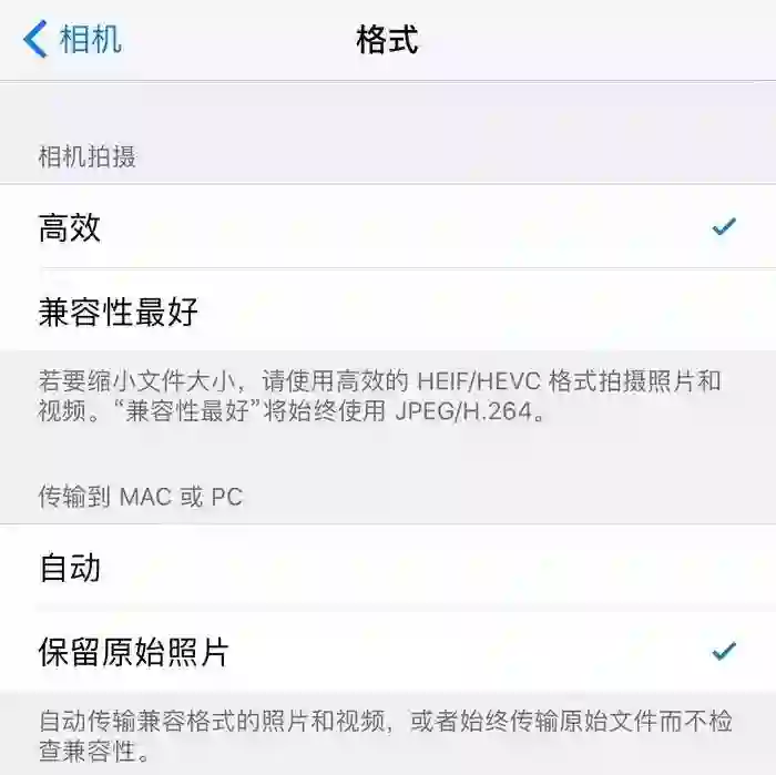 你可以通过设置 -> 相机 -> 格式看到这个选项。值得注意的是,新的压缩格式仅支持配备 A10 芯片以上的设备,即 iPhone 7 及之后的系列。不过,采用 A9 芯片的设备可以对新格式进行解码和播放。如果你的设备容量足够,我其实不太建议打开此选项,因为你的照片在其他设备上可能会出现兼容性问题。