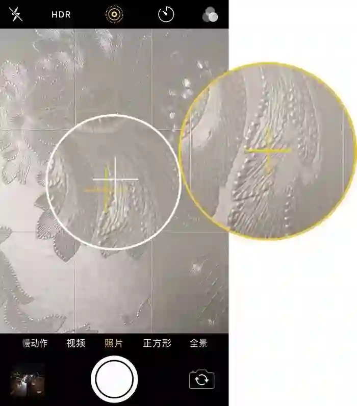 新的水平参考线和指南针里的样式非常相似,由两个十字符号组成。当黄色和白色的十字符号完全重合时,即代表手机处于水平状态。我有时候会拍摄地面上的规则纹理,之前需要靠手感保持手机水平来避免画面变形,现在就更加方便了。