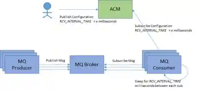 基本原理如下。其中,管理员或应用程序通过ACM控制台发布消费延时配置(RCV_INTERVAL_TIME),所有MQ消费程序订阅该配置。理论上,该配置从发布到下发所有客户端,可以在1秒内完成(取决于网络演示)。