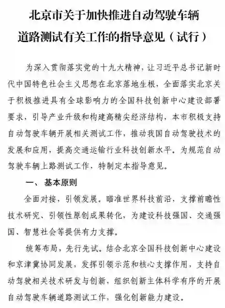 附件一:北京市关于加快推进自动驾驶车辆道路测试有关工作的指导意见(试行)