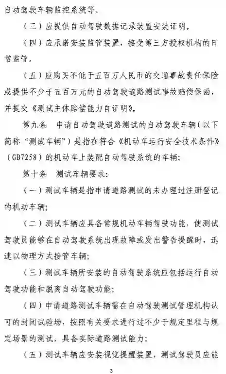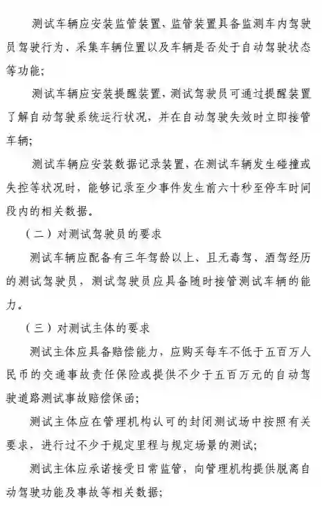 申请道路测试的车辆必须符合国家机动车运行安全技术条件,并且具备自动、人工两种驾驶模式,可在两种模式间随时切换;