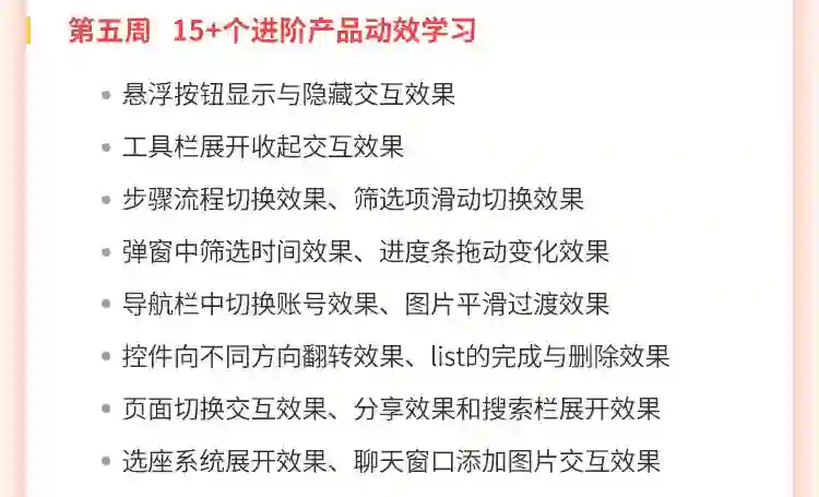 在前2周功能基础掌握的情况下,你会系统学习到web端、手机端的产品交互动效,进阶学习切换、拖动、平滑等15+个进阶效果