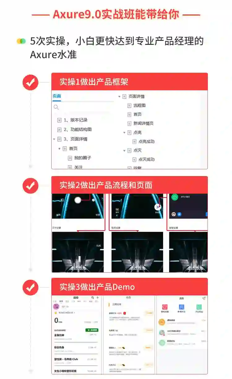 为了能够让产品新人通过高效的方法,快速实现产品原型,满足产品工作所需,Axure实战班采用录播+直播的形式,系统学习Axure操作和原型思维。