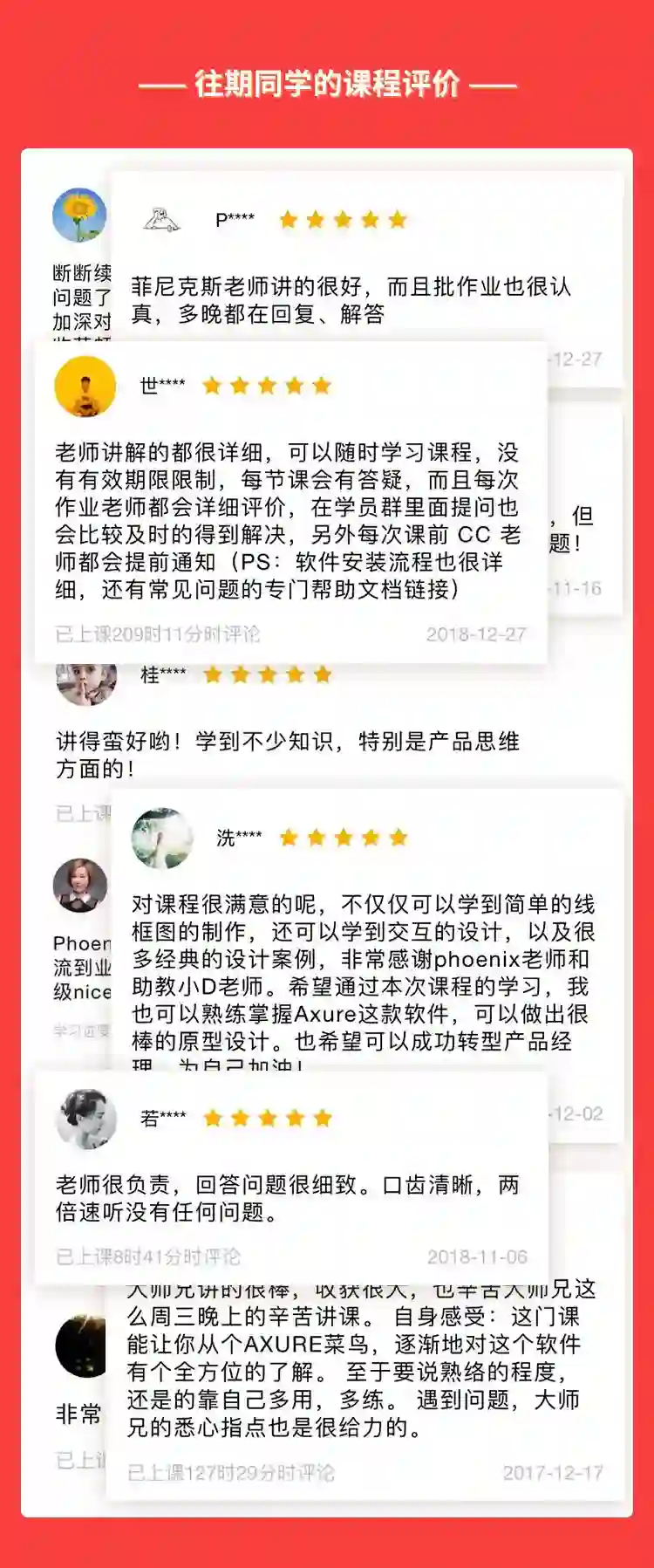 6周Axure实战班通过4500+学员验证和反馈,迭代了多次,课程通俗易懂。坐公交、地铁或者吃饭的时候都能听,充分利用碎片时间。