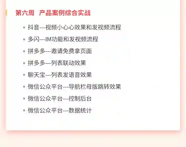Axure实战班安排了6次直播课,老师会在直播课上讲解更多的交互和产品设计。让你在学Axure的同时,培养对产品的理解,对交互的感觉