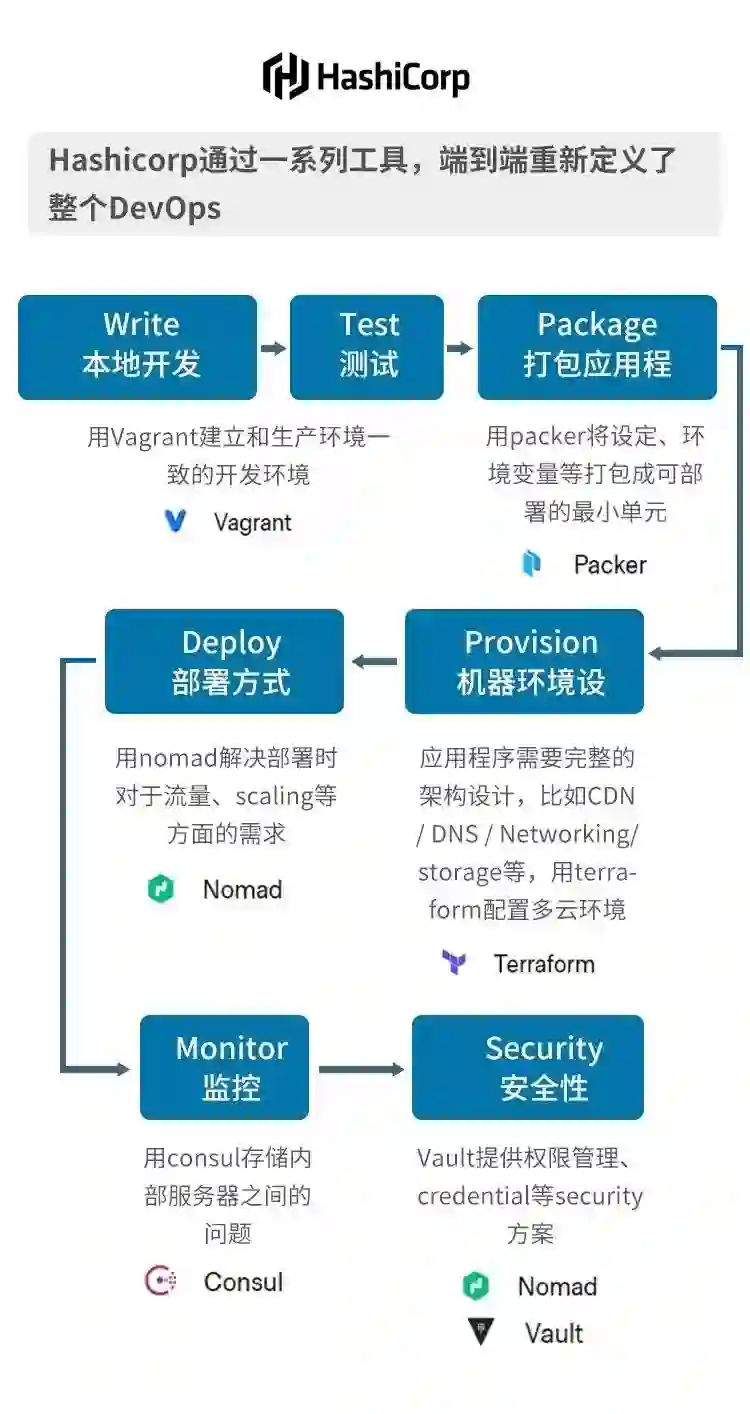HashiCorp 公司总部位于旧金山(尽管 90% 的员工是远程办公),发展得益于其开源工具的日益普及,主要产品包括用于基础设施配置的 Terraform、用于管理密码的平台 Vault、用于网络管理的 Consul 以及调度程序和工作负载协调器 Nomad。