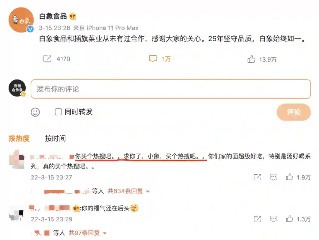 有网友哭谏白象去买个热榜,结果是白象没有花钱,但热榜有了。
