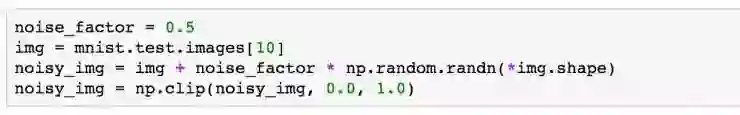 我们通过上面一个简单的例子来看一下如何加入噪声,我们获取一张图片的数据 img(大小为 784),在它的基础上加入噪声因子乘以随机数的结果,就会改变图片上的像素。接着,由于 MNIST 数据的每个像素数据都被处理成了 0-1 之间的数,所以我们通过 numpy.clip 对加入噪声的图片进行 clip 操作,保证每个像素数据还是在 0-1 之间。