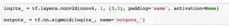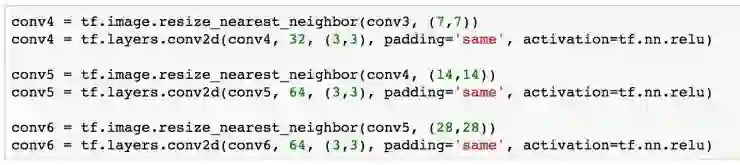 在 TensorFlow 中也封装了对 Upsample 的操作,我们使用 resize_nearest_neighbor 对 Encoder 卷积的结果 resize,进而再进行卷积处理。经过三次 Upsample 的操作,我们得到了 28 x 28 x 64 的数据大小。最后,我们要将这个结果再进行一次卷积,处理成我们原始图像的大小。
