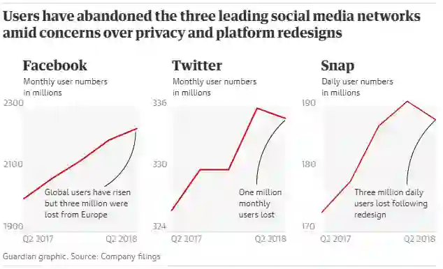对比 Facebook 和 Twitter 在面对隐私泄露和外部监管等等危机而笼上的阴霾,《卫报》和《纽约时报》分别刊文提出了疑问:社交媒体的增长是否已经到达了顶峰?