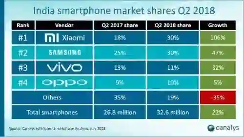 7月20日消息,科技市场研究公司Canalys的最新数据显示,今年第二季度,三星和小米在印度的智能手机出货量均为990万部,共占印度智能手机市场60%的份额,这与去年的43%相比有所上升。小米仍然位居榜首,其手机销量增长了106%,市场份额从18%升至30%,该公司第二季度在印度卖出了330万部红米5A。