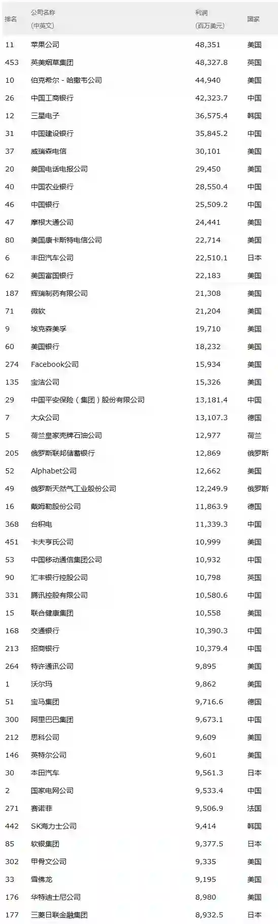 苹果高居利润榜首位,英美烟草集团排在第二位。中国入利润榜前10位的公司仍是工建农中四大银行。在净资产收益率榜上,波音公司位居首位,排位靠前的中国公司是腾讯、碧桂园、华为、美的和台积电。
