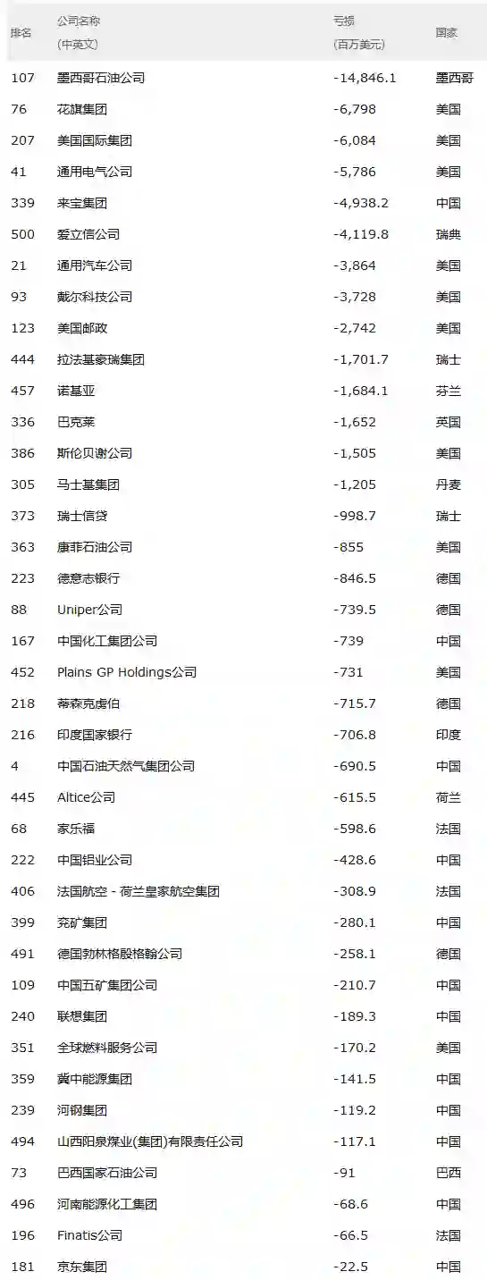 7月20日上午消息,《财富》昨日发布世界500强排行榜。在2018年世界500强亏损公司的子榜单中,墨西哥石油公司亏损148亿美元,成为亏损最多公司。爱立信、戴尔、诺基亚、联想集团、京东等科技企业也登上榜单。