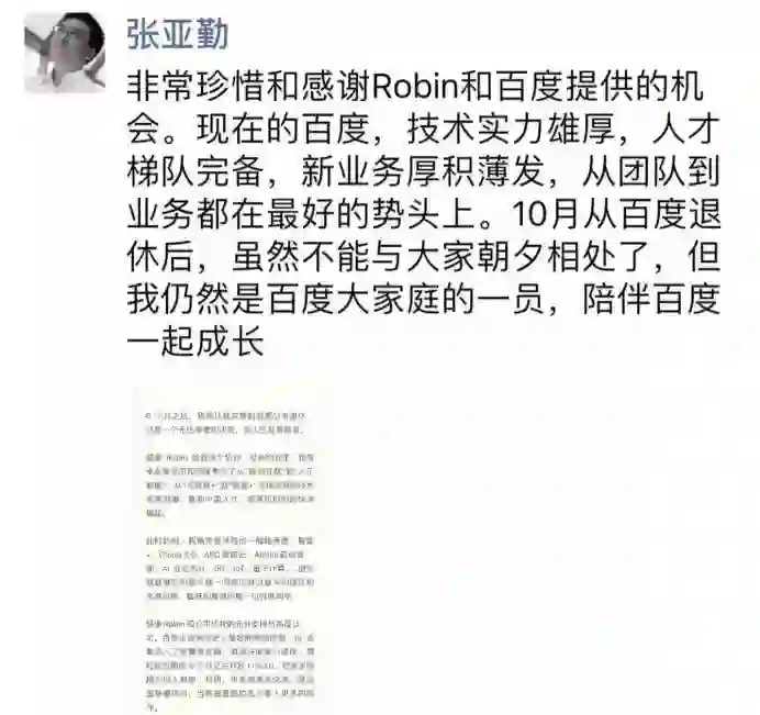 在过去几年间,亚勤和家人不在一个城市,陪伴的时间很少,在多年投入地工作之后,他希望可以更多地和家人在一起。在此我们理解并同意亚勤的选择,感谢他过去的辛勤奉献,并祝福他未来生活美好、身体健康、阖家幸福。亚勤永远都是百度大家庭的一员!我也想借此机会,感谢所有辛苦付出、做出贡献的百度同学,感谢每一位曾经在百度公司工作过的同事。