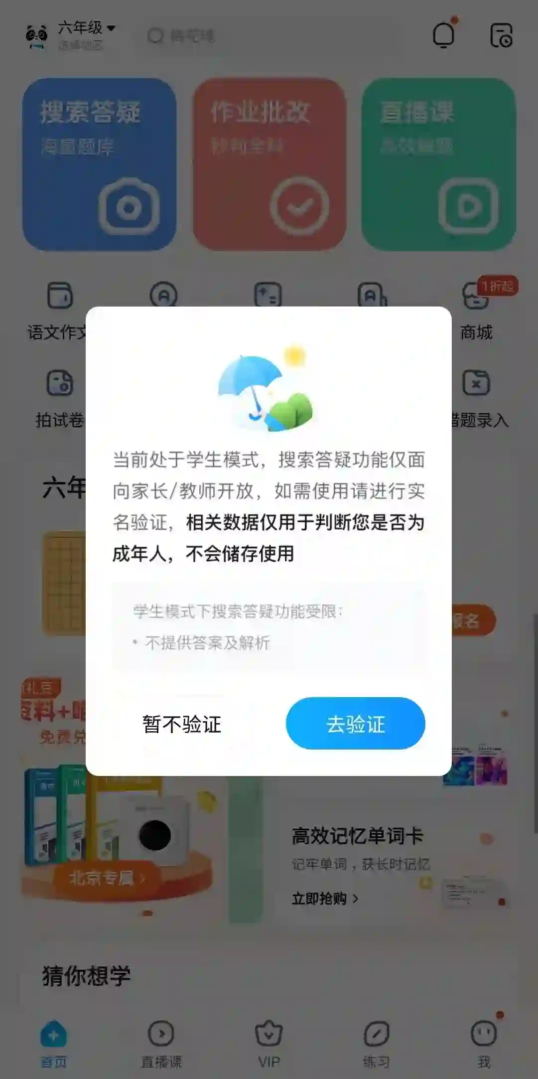 目前仍有一些App中的拍照搜题功能够正常使用。以小猿搜题为例,只需在首次登录时选择“已满14周岁”,不需要其他认证,便可以顺利使用拍照搜题,并查看详细的题目解析。