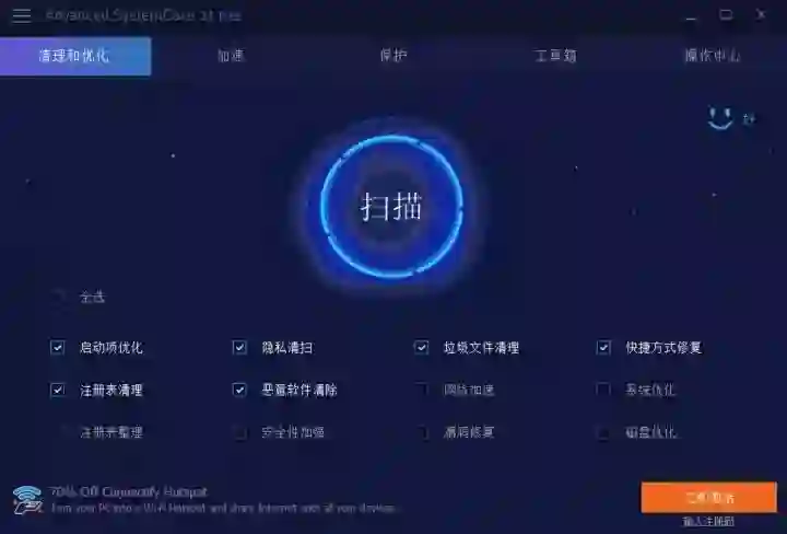 Advanced SystemCare 是一款出自 IObit 之手的优秀系统优化软件。提供了清理优化、系统加速、简单的系统保护等功能,界面简单干净,清理速度快。Free 版本就能完成大部分清理工作,并对常用功能进行优化。