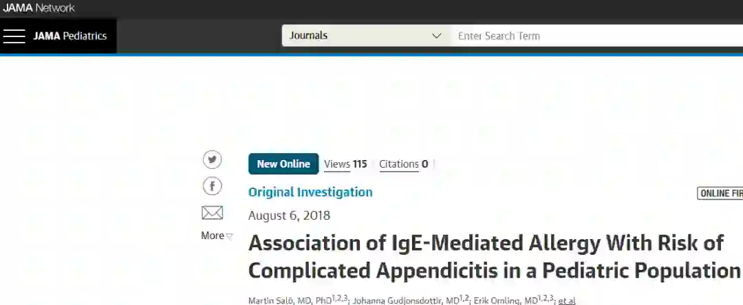 8月6日,这项发现以“Association of IgE-Mediated Allergy With Risk of Complicated Appendicitis in a Pediatric Population”为题发表在《JAMA Pediatrics》杂志上,文章论述了过敏儿童患复杂阑尾炎的风险较低的最新成果,或为未来发现新诊断工具铺平道路。