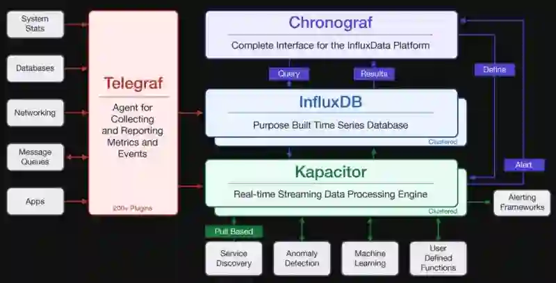 TICK 就是我们所说的构成 InfluxData 平台的组件集,代表了我们用于解决时序数据库问题的四个组件:Telegraf(我们的数据收集器)、InfluxDB(我们的时序数据库)、Chronograf(我们的可视化 UI)和 Kapacitor(我们的处理和监控服务)。这些组件的当前版本是公司随时间推移而逐步推出的工件。