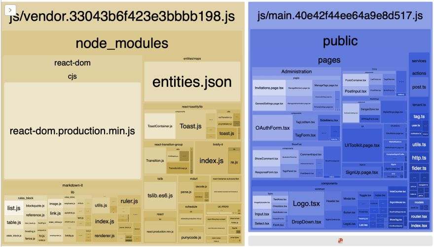 通过使用 Webpack Bundle Analyzer,我们注意到,在 Vendor Bundle 中引入了 response-toastify。response-toastify 是我们用于弹出消息提示的 toaster 库。在 Fider 中,我们很少弹出消息,那么把 response-toastify 直接引入 Bundle 就不是非常合理。假如用户并不需要显示弹出消息,那为什么要向他们推送这 30kB 的 JavaScript 代码呢?
