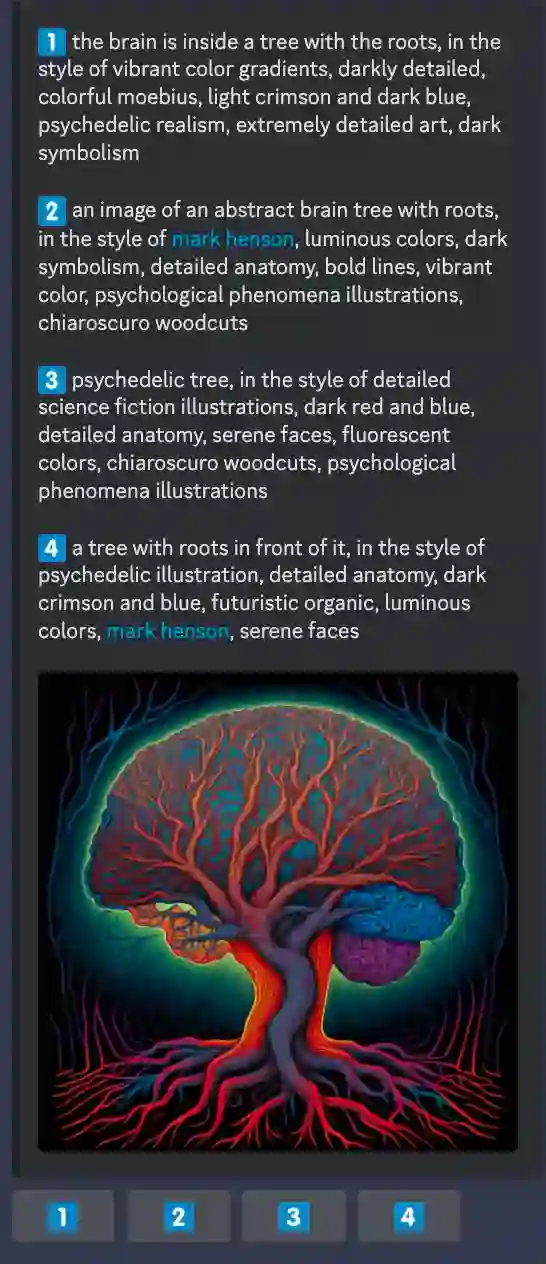 底部的四个数字是混合按钮,每个数字都与相应的描述相匹配。单击数字,Midjourney 会根据新的描述重新混合图像。