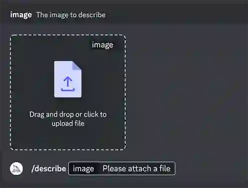 用户只需从写一个「 /describe」开始,Midjourney 提供了上传图像的位置: