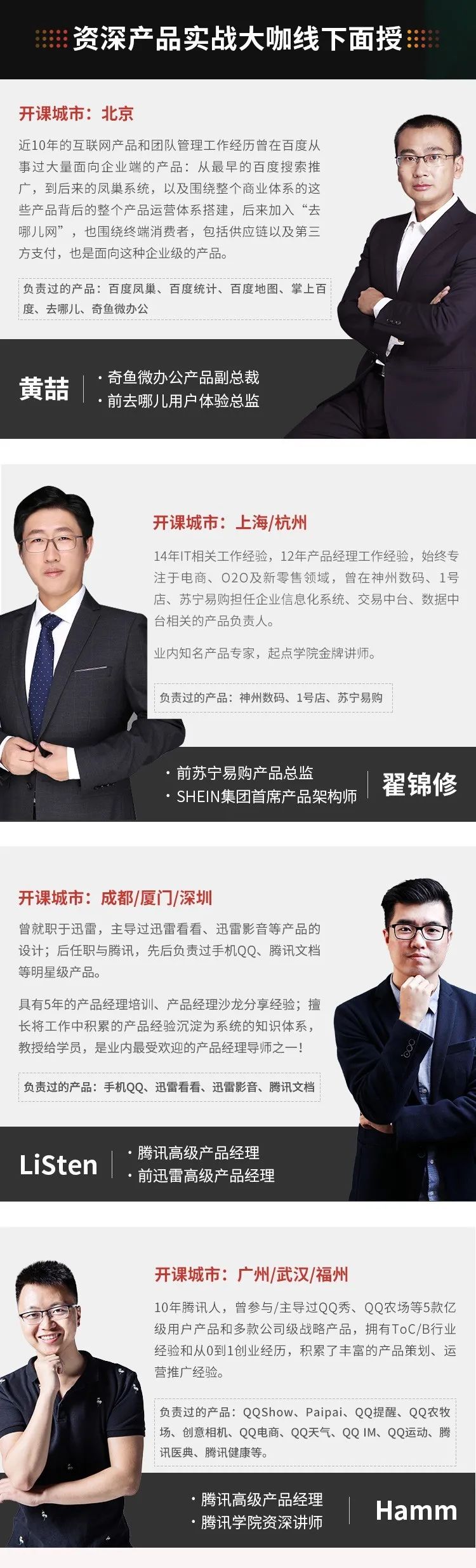 课程特邀4位10年+产品经验的老司机,线下亲自授课,尤其适合1~3年的产品从业者。