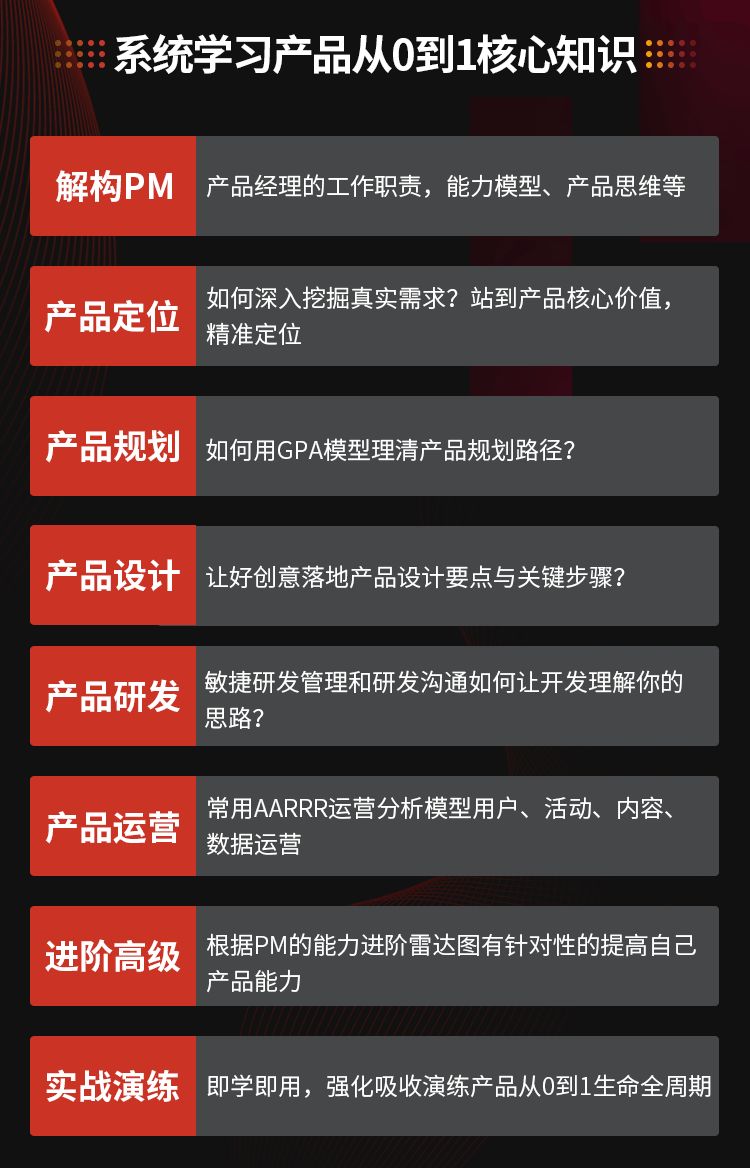 最终让你在学习过程中能够把所有相关技能串联起来,具备“可独立负责一个产品从0到1各个核心环节的落地”的能力。解决学习过程中对于每个知识点都了解一些,但是都了解不深的情况。