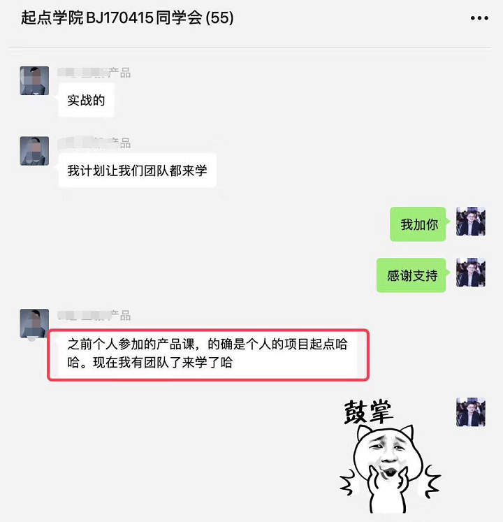 比如,17年【产品经理实战训练营】的老学员,通过实战营的学习,将所学方法很好的运用在自己的工作中,在3年后拥有了自己的产品团队,并带着自己的产品团队重返产品实战营学习。